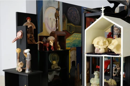 The installation is open to the entrance from several directions, inviting the viewer to meet a world full of strange and intriguing objects - a kind of contemporary wonder room. A fantastic world made up of hybrid objects and colorful paintings that require a long and careful examination to experience the cultural multiplicity.